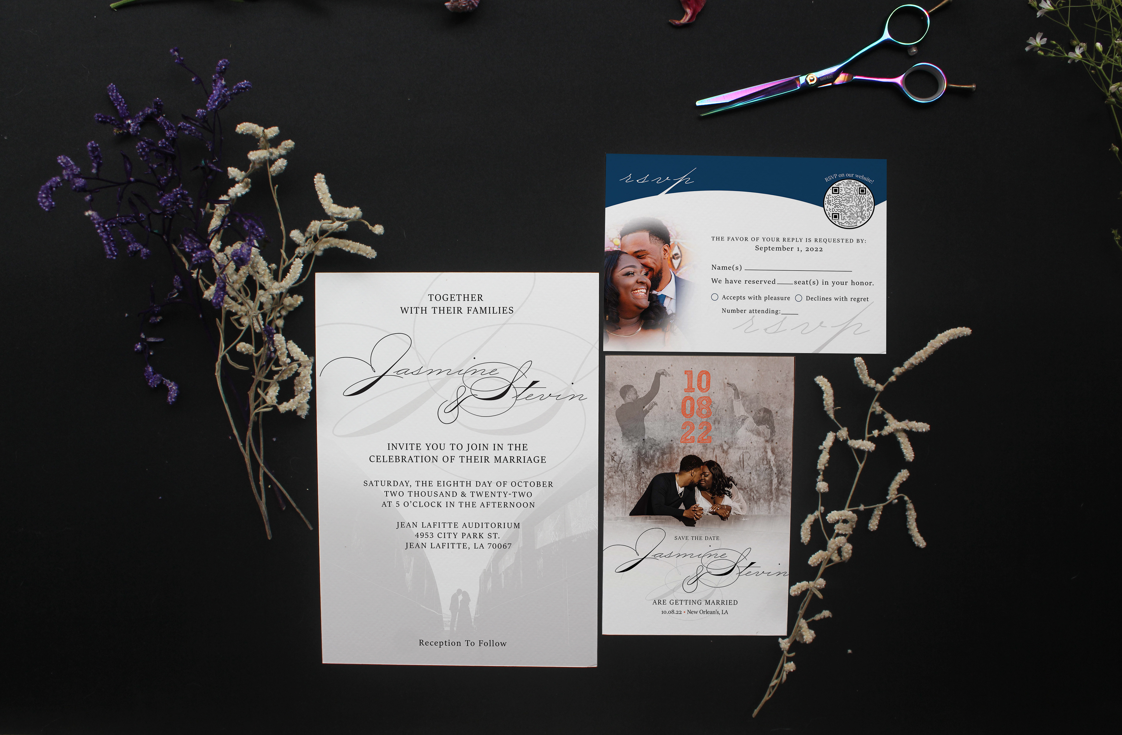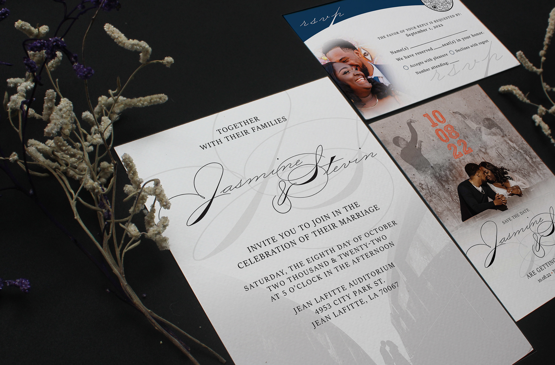 Wedding Invitation, RSVP Card & Save the Date with imagery provided from the client.